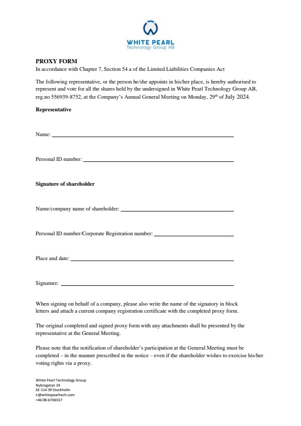 notify the Company of their and eventual proxies’ intention to attend the Annual General Meeting on Tuesday 25th July 2024 at latest. Notification can be made in writing to the address White Pearl Technology AB, Box 5216,102 45 Stockholm, by phone +46 8 6706557, or by e- mail [email protected]