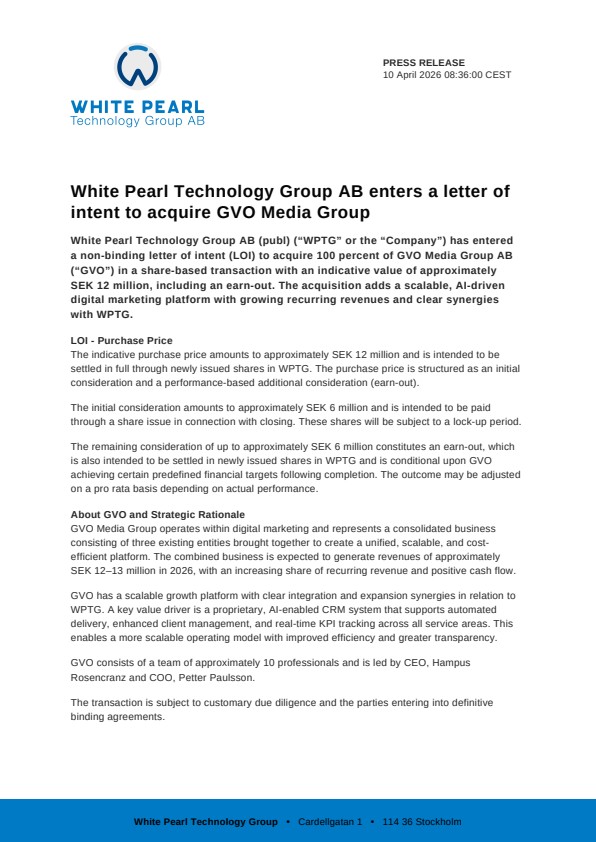 White Pearl Technology Group AB (publ) (“WPTG” or the “Company”) has entered a non-binding letter of intent (LOI) to acquire 100 percent of GVO Media Group AB (“GVO”) in a share-based transaction with an indicative value of approximately SEK 12 million, including an earn-out. The acquisition adds a scalable, AI-driven digital marketing platform with growing recurring revenues and clear synergies with WPTG.