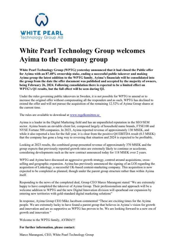 Under the rules governing public takeovers in Sweden, it is not possible for WPTG to amend or to increase the original offer without compensating all the responders and as such, WPTG has declined to extend the offer and will not pursue the acquisition of the remaining 12.52% of Ayima Group shares at the current time.