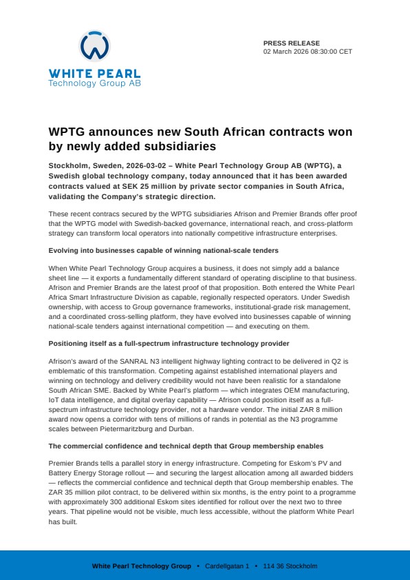 Stockholm, Sweden, 2026-03-02 – White Pearl Technology Group AB (WPTG), a Swedish global technology company, today announced that it has been awarded contracts valued at SEK 25 million by private sector companies in South Africa, validating the Company’s strategic direction.