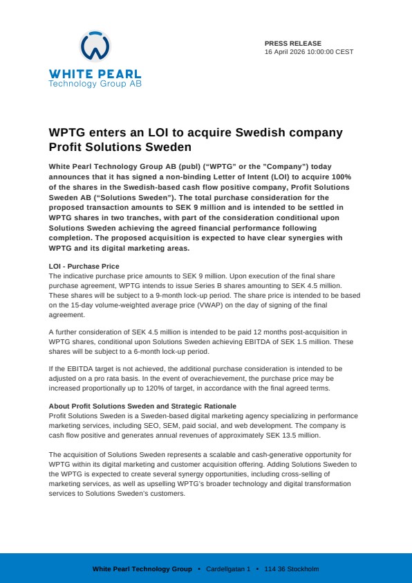 White Pearl Technology Group AB (publ) (“WPTG” or the ”Company”) today announces that it has signed a non-binding Letter of Intent (LOI) to acquire 100% of the shares in the Swedish-based cash flow positive company, Profit Solutions Sweden AB (“Solutions Sweden”). The total purchase consideration for the proposed transaction amounts to SEK 9 million and is intended to be settled in WPTG shares in two tranches, with part of the consideration conditional upon Solutions Sweden achieving the agreed financial performance following completion. The proposed acquisition is expected to have clear synergies with WPTG and its digital marketing areas.