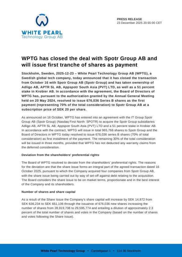 Stockholm, Sweden, 2025-12-23 – White Pearl Technology Group AB (WPTG), a Swedish global tech company, today announced that it has closed the transaction from October 16 with Spotr Group AB (Spotr Group) and has taken ownership of Adligo AB, APTR SL AB, Appspotr South Asia (PVT) LTD, as well as a 51 percent stake in Krobier AB. In accordance with the agreement, the Board of Directors of WPTG has, pursuant to the authorization granted by the Annual General Meeting held on 20 May 2024, resolved to issue 676,036 Series B shares as the first payment (representing 70% of the total consideration) to Spotr Group AB at a subscription price of SEK 20 per share.