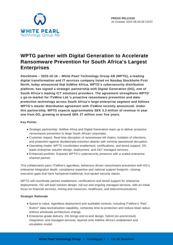 Stockholm – 2025-10-16 – White Pearl Technology Group AB (WPTG), a leading digital transformation and IT services company listed on Nasdaq Stockholm First North, today announced that ItsMine Africa, WPTG’s cybersecurity distribution platform, has signed a strategic partnership with Digital Generation (DG), one of South Africa’s leading ICT solutions providers. The agreement strengthens WPTG’s go-to-market for ITsMine Ltd.’s proactive ransomware prevention and data-protection technology across South Africa’s large-enterprise segment and follows WPTG’s master distribution agreement with ITsMine recently announced. Under this partnership, WPTG expects approximately SEK 3.3 million of revenue in year one from DG, growing to around SEK 27 million over five years.