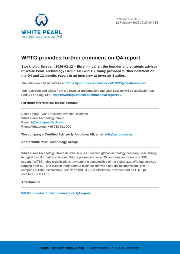 Stockholm, Sweden, 2026-02-12 – Ebrahim Laher, the founder and strategic advisor of White Pearl Technology Group AB (WPTG), today provided further comment on the Q4 and 12 months report in an interview at Investor Studios.