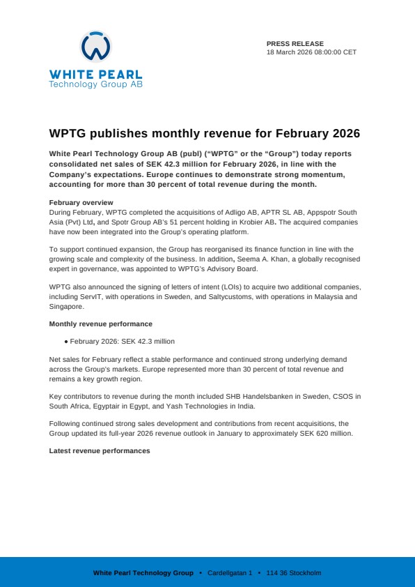 White Pearl Technology Group AB (publ) (“WPTG” or the “Group”) today reports consolidated net sales of SEK 42.3 million for February 2026, in line with the Company’s expectations. Europe continues to demonstrate strong momentum, accounting for more than 30 percent of total revenue during the month.
