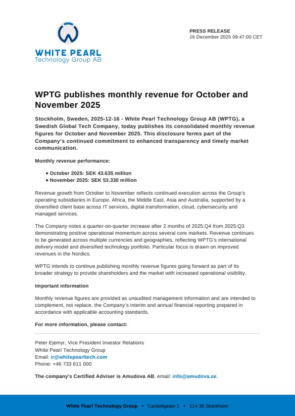 Stockholm, Sweden, 2025-12-16 – White Pearl Technology Group AB (WPTG), a Swedish Global Tech Company, today publishes its consolidated monthly revenue figures for October and November 2025. This disclosure forms part of the Company’s continued commitment to enhanced transparency and timely market communication.