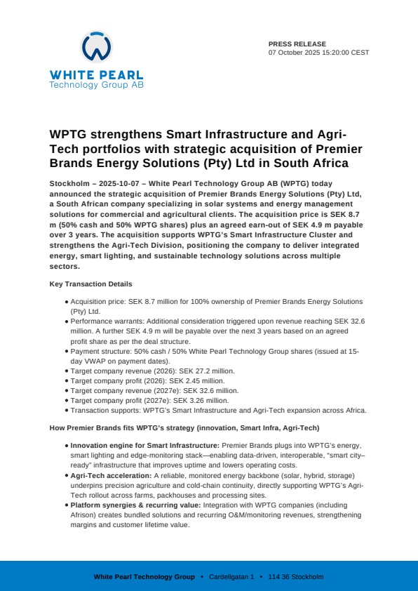 Stockholm – 2025-10-07 – White Pearl Technology Group AB (WPTG) today announced the strategic acquisition of Premier Brands Energy Solutions (Pty) Ltd, a South African company specializing in solar systems and energy management solutions for commercial and agricultural clients. The acquisition price is SEK 8.7 m (50% cash and 50% WPTG shares) plus an agreed earn-out of SEK 4.9 m payable over 3 years. The acquisition supports WPTG’s Smart Infrastructure Cluster and strengthens the Agri-Tech Division, positioning the company to deliver integrated energy, smart lighting, and sustainable technology solutions across multiple sectors.