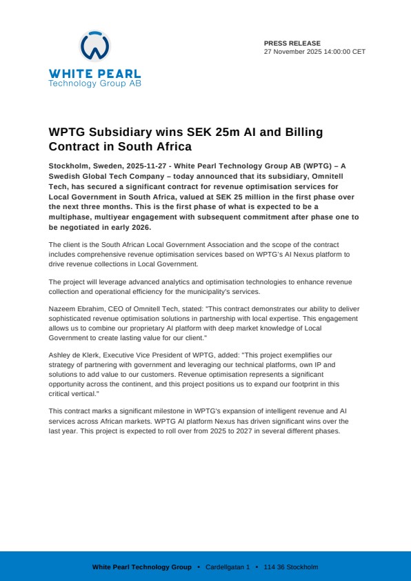 Stockholm, Sweden, 2025-11-27 – White Pearl Technology Group AB (WPTG) – A Swedish Global Tech Company – today announced that its subsidiary, Omnitell Tech, has secured a significant contract for revenue optimisation services for Local Government in South Africa, valued at SEK 25 million in the first phase over the next three months. This is the first phase of what is expected to be a multiphase, multiyear engagement with subsequent commitment after phase one to be negotiated in early 2026.