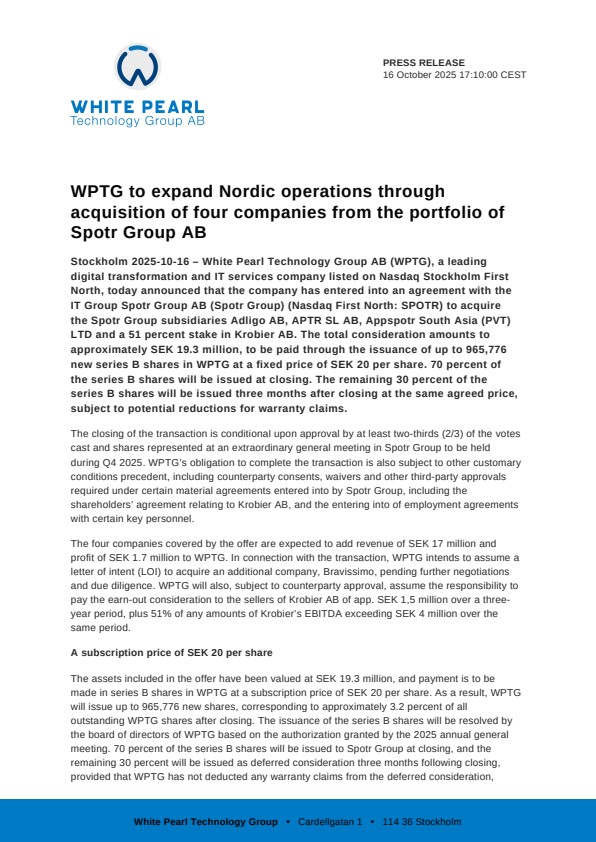 Stockholm 2025-10-16 – White Pearl Technology Group AB (WPTG), a leading digital transformation and IT services company listed on Nasdaq Stockholm First North, today announced that the company has entered into an agreement with the IT Group Spotr Group AB (Spotr Group) (Nasdaq First North: SPOTR) to acquire the Spotr Group subsidiaries Adligo AB, APTR SL AB, Appspotr South Asia (PVT) LTD and a 51 percent stake in Krobier AB. The total consideration amounts to approximately SEK 19.3 million, to be paid through the issuance of up to 965,776 new series B shares in WPTG at a fixed price of SEK 20 per share. 70 percent of the series B shares will be issued at closing. The remaining 30 percent of the series B shares will be issued three months after closing at the same agreed price, subject to potential reductions for warranty claims.